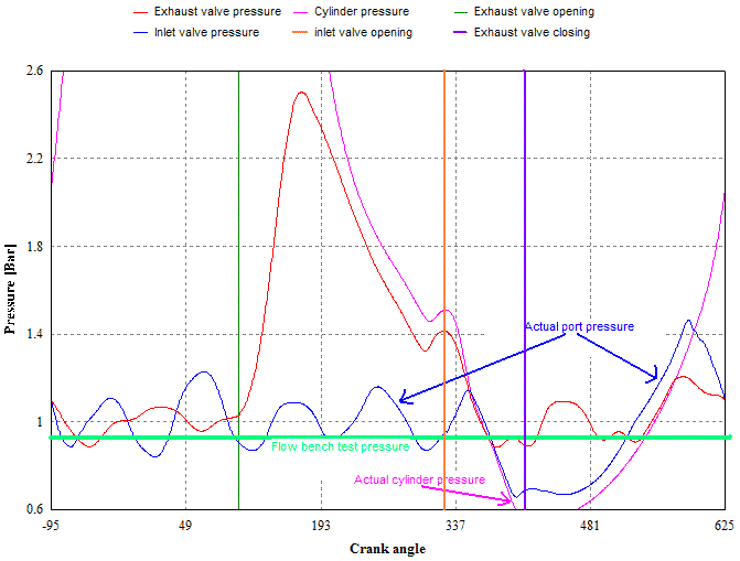 This graph, generated with an engine simulation program, shows how widely the pressures vary in a running engine vs. the steady test pressure of the flow bench.
