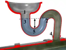 The air lock phenomenon can be used in a number of useful ways. The adjacent diagram shows an 'S' trap. This has the properties a) that liquid can flow from top (1) to bottom (4) unhindered and b) that gas cannot flow through the trap unless it has enough extra pressure to overcome the liquid head of the trap. This is usually about 75 to 100 mm of water and prevents foul smelling air coming back from water drainage systems via connections to toilets, sinks and so on. 'S' traps work well unless the drainage water has sand in it - which then collects in the 'U' part of the 'S'.