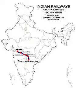 The 17063 / 17064 Ajanta Express is an express train belonging to South Central Railway Zone that runs between Secunderabad and Manmad in India. It is operated with 17063/17064 train numbers on Daily basis.