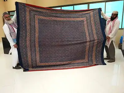 Ajrak (Sindhi: اجرڪ), also known as Ajrakh is a unique form of blockprinting found in Sindh, Pakistan; Kutch, Gujarat; and Barmer, Rajasthan in India. These shawls display special designs and patterns made using block printing by stamps. Over the years, ajraks have become a symbol of the Sindhi culture and traditions.[1] Ajrak print is also famous in neighbouring areas of India in the states of Rajasthan and Gujarat due to their influence from Indus Valley Civilization in Sindh, Pakistan.[2]