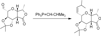 The Wittig reaction involves reaction of an aldehyde or ketone with a Wittig reagent (or phosphorane) of the type Ph3P=CHR to produce an alkene and Ph3P=O. The Wittig reagent is itself prepared easily from triphenylphosphine and an alkyl halide. The reaction is quite general and many functional groups are tolerated, even esters, as in this example:[19]