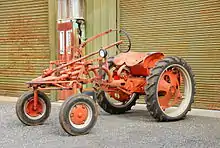 The Model G is a small implement carrier tractor that was made by the Allis-Chalmers Manufacturing Company. At the time of its introduction the Model G was unique for its rear-mounted, Continental N62 engine.[1] It was a four-cylinder engine with a 2⅜ × 3½ inch bore and stroke.[2] The Model G was designed for small farms and vegetable gardeners, and a line of implements specifically designed for it, including ploughs, planters, and cultivators. The design of the Model G allowed for a great view of the belly-mounted implements.