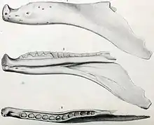 Creosaurus, Epanterias, and Labrosaurus are regarded as junior synonyms of Allosaurus.[23] Most of the species that are regarded as synonyms of A. fragilis, or that were misassigned to the genus, are obscure and were based on scrappy remains. One exception is Labrosaurus ferox, named in 1884 by Marsh for an oddly formed partial lower jaw, with a prominent gap in the tooth row at the tip of the jaw, and a rear section greatly expanded and turned down.[70] Later researchers suggested that the bone was pathologic, showing an injury to the living animal,[28] and that part of the unusual form of the rear of the bone was due to plaster reconstruction.[71] It is now regarded as an example of A. fragilis.[23]