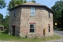 A historic octagonal cobblestone building (built 1832), formerly a blacksmith shop, is located on the corner of Alloway Road and Water Street in the hamlet, just off N.Y. Route 14.[2] There was a land office (built c. 1835), also located in Alloway. It has since been moved to the Genesee Country Village & Museum in Mumford, near Rochester.[3]