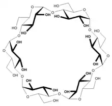 α-Cyclodextrin is a hexasaccharide derived from glucose. It is related to the β- (beta) and γ- (gamma) cyclodextrins, which contain seven and eight glucose units, respectively. All cyclodextrins are white, water-soluble solids with minimal toxicity. Cyclodextrins tend to bind other molecules in their quasi-cylindrical interiors. This inclusion (and release) behavior leads to applications in medicine.[1] The compound is of wide interest because it exhibits host–guest properties, forming inclusion compounds.[2]