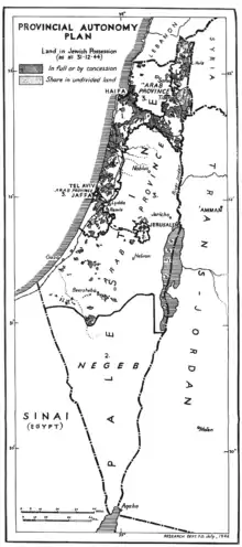 The Anglo-American Committee of Inquiry was a joint British and American committee assembled in Washington on 4 January 1946. The committee was tasked to examine political, economic and social conditions in Mandatory Palestine as they bear upon the problem of Jewish immigration and settlement therein and the well-being of the peoples now living therein; to consult representatives of Arabs and Jews, and to make other recommendations 'as may be necessary' to for ad interim handling of these problems as well as for their permanent solution.[1] The report, entitled "Report of the Anglo-American Committee of Enquiry Regarding the Problems of European Jewry and Palestine",[2] was published in Lausanne on 20 April 1946.