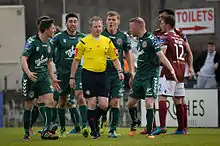 ![]() Buttimer surrounded by Bohemian's players during their 2015 League of Ireland game with Galway United at Eamon Deacy Park | |||