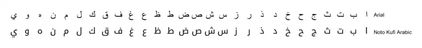 Some Arabic fonts are calligraphic, for example Arial, Courier New, and Times New Roman.They look like written with a brush or oblong pen. Other fonts use a mono-linear style more akin to sans-serif Latin scripts. Monolinear means that the lines have the same width throughout the letter.