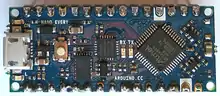 In 2019, Arduino released the Arduino Nano Every, an pin-equivalent evolution of the Nano. It features a more powerful ATmega4809 processor, and twice the RAM.[4]
