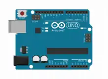 The Arduino Uno is an open-source microcontroller board based on the Microchip ATmega328P microcontroller and developed by Arduino.cc.[2][3] The board is equipped with sets of digital and analog input/output (I/O) pins that may be interfaced to various expansion boards (shields) and other circuits.[1] The board has 14 digital I/O pins (six capable of PWM output), 6 analog I/O pins, and is programmable with the Arduino IDE (Integrated Development Environment), via a type B USB cable.[4] It can be powered by the USB cable or by an external 9-volt battery, though it accepts voltages between 7 and 20 volts. It is similar to the Arduino Nano and Leonardo.[5][6] The hardware reference design is distributed under a Creative Commons Attribution Share-Alike 2.5 license and is available on the Arduino website. Layout and production files for some versions of the hardware are also available.
