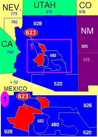 | West: 928 | area code 623 | East: 480, 520, 602 |