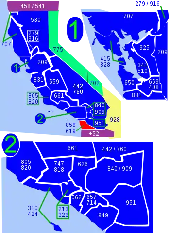 | West: Pacific Ocean, 808 | area codes 619/858 | East: 442/760 |