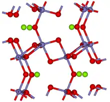 Chemical composition of most armalcolite samples can be decomposed into a sum of metal oxides as follows: TiO2 (concentration 71–76%), FeO (10–17%), MgO (5.5–9.4%), Al2O3 (1.48-2%), Cr2O3 (0.3-2%) and MnO (0-0.83%). Whereas the titanium content is relatively constant, the ratio of magnesium to iron varies and is usually lower than 1.[1][9] A so-called Cr-Zr-Ca variety of armacolite is distinguished which has an elevated content of Cr2O3 (4.3–11.5%), ZrO2 (3.8–6.2%) and CaO (3-3.5%). These varieties are not distinct and intermediate compositions are also found.[12] The iron-poor (magnesium-rich) modification of armacolite has the same crystal structure and occurs in the Earth's crust as the mineral unofficially named "karrooite".[14][17]