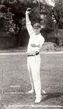 He made his debut for Derbyshire against Lancashire in May 1897.[2] During his time at Derbyshire, he was partnered by Billy Bestwick in a dangerous fast-bowling partnership that never gained much reward because they had very small totals to bowl at.[2] Though rarely judged a better bowler than Bestwick, it was owing to his superiority as a batsman and fieldsman that Warren gained the pair's only England cap against Australia at Headingley in 1905.
