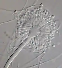 Aspergillus versicolor has long, septate hyphae that appear glassy and transparent. Conidiphores, which are specialized hyphal stalks for asexual reproduction, typically measure 120–700 μm in length. Conidiophores terminate in small vesicles (10–15 μm in diameter) that are biseriate (i.e., with two successive layers of cells interposing the vesicle and conidia). The first layer of cells are called metulae upon which phialides are borne. The vesicles are variable in shape but are often described as "spoon-shaped".[10] Conidia are spherical, approximately 2.5–3.5 μm in diameter, and may have smooth or slightly roughened surfaces.[1][6]