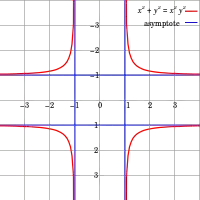 The asymptotes of an algebraic curve in the affine plane are the lines that are tangent to the projectivized curve through a point at infinity.[13] For example, one may identify the asymptotes to the unit hyperbola in this manner. Asymptotes are often considered only for real curves,[14] although they also make sense when defined in this way for curves over an arbitrary field.[15]