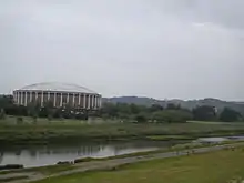 Athens is located in the unglaciated Allegheny Plateau about 47 miles from Chillicothe and 35 miles west of Marietta. Athens is surrounded by hills that rise about three hundred feet from river valley to the narrow ridge tops. The county extends west from the Ohio River, mostly centered around the lower Hocking River watershed. According to the 2010 census, the city has a total area of 10.05 square miles (26.0 km2), of which 9.83 square miles (25.5 km2) (or 97.81%) is land and 0.22 square miles (0.57 km2) (or 2.19%) is water.[17] Large sections of Athens and Ohio University are located in the floodplain of the Hocking River. Over the last two centuries the town suffered from many destructive floods, including notable floods in 1832, 1873, 1907, 1937, 1949, 1964 and 1968.[18] In 1969 the Army Corps of Engineers completed a major work that rerouted and expanded the channel of the Hocking River, for a stretch of several miles around the town, moving the river hundreds of feet to the south.[18] That project and the ongoing efforts to maintain the channel have greatly reduced the negative effects of seasonally high river levels.
