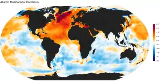 The Atlantic Multidecadal Oscillation (AMO), also known as Atlantic Multidecadal Variability (AMV),[1] is a climate cycle that affects the sea surface temperature (SST) of the North Atlantic Ocean based on different modes on multidecadal timescales.[2] While there is some support for this mode in models and in historical observations, controversy exists with regard to its amplitude, and in particular, the attribution of sea surface temperature change to natural or anthropogenic causes, especially in tropical Atlantic areas important for hurricane development.[3] The Atlantic multidecadal oscillation is also connected with shifts in hurricane activity, rainfall patterns and intensity, and changes in fish populations.[4]