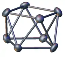Zintl compounds feature naked anionic clusters that are generated by reduction of heavy main group p elements, mostly metals or semimetals, with alkali metals, often as a solution in anhydrous liquid ammonia or ethylenediamine.[9] Examples of Zintl anions are [Bi3]3−, [Sn9]4−, [Pb9]4−, and [Sb7]3−.[10] Although these species are called "naked clusters," they are usually strongly associated with alkali metal cations. Some examples have been isolated using cryptate complexes of the alkali metal cation, e.g., [Pb10]2− anion, which features a capped square antiprismatic shape.[11] According to Wade's rules (2n+2) the number of cluster electrons is 22 and therefore a closo cluster. The compound is prepared from oxidation of K4Pb9 [12] by Au+ in PPh3AuCl (by reaction of tetrachloroauric acid and triphenylphosphine) in ethylene diamine with 2.2.2-crypt. This type of cluster was already known as is the endohedral Ni@Pb102− (the cage contains one nickel atom). The icosahedral tin cluster Sn122− or stannaspherene anion is another closed shell structure observed (but not isolated) with photoelectron spectroscopy.[13][14] With an internal diameter of 6.1 Ångstrom, it is of comparable size to fullerene and should be capable of containing small atoms in the same manner as endohedral fullerenes, and indeed exists a Sn12 cluster that contains an Ir atom: [Ir@Sn12]3−.[15]