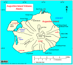 Augustine Volcano is a stratovolcano consisting of a central complex of summit lava domes and flows surrounded by an apron of pyroclastic, lahar, avalanche, and ash deposits. The volcano is frequently active, with major eruptions recorded in 1883, 1935, 1963–64, 1976, 1986, and 2006. Minor eruptive events were reported in 1812, 1885, 1908, 1944, and 1971. The large eruptions are characterized by an explosive onset followed by the quieter effusion of lava.[3] It forms Augustine Island in southwestern Cook Inlet in the Kenai Peninsula Borough of southcentral coastal Alaska, 174 miles (280 km) southwest of Anchorage. Augustine Island has a land area of 32.4 square miles (83.9 km2), while West Island, just off Augustine's western shores, has 2 sq mi (5.2 km2). The irregular coastline of Augustine Island is due to the repeated catastrophic collapse of the summit dome, forming debris avalanches down the flanks and into Cook Inlet.[4]
