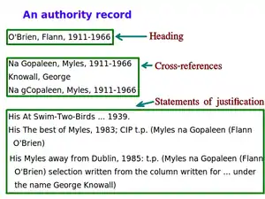 For example, the Irish writer Brian O'Nolan, who lived from 1911 to 1966, wrote under many pen names such as Flann O'Brien and Myles na Gopaleen. Catalogers at the United States Library of Congress chose one form—"O'Brien, Flann, 1911–1966"—as the official heading.[20] The example contains all three elements of a valid authority record: the first heading O'Brien, Flann, 1911–1966 is the form of the name that the Library of Congress chose as authoritative. In theory, every record in the catalog that represents a work by this author should have this form of the name as its author heading. What follows immediately below the heading beginning with Na Gopaleen, Myles, 1911–1966 are the see references. These forms of the author's name will appear in the catalog, but only as transcriptions and not as headings. If a user queries the catalog under one of these variant forms of the author's name, he or she would receive the response: "See O'Brien, Flann, 1911–1966." There is an additional spelling variant of the Gopaleen name: "Na gCopaleen, Myles, 1911–1966" has an extra C inserted because the author also employed the non-anglicized Irish spelling of his pen-name, in which the capitalized C shows the correct root word while the preceding g indicates its pronunciation in context. So if a library user comes across this spelling variant, he or she will be led to the same author regardless. See also references, which point from one authorized heading to another authorized heading, are exceedingly rare for personal name authority records, although they often appear in name authority records for corporate bodies. The final four entries in this record beginning with His At Swim-Two-Birds ... 1939. constitute the justification for this particular form of the name: it appeared in this form on the 1939 edition of the author's novel At Swim-Two-Birds, whereas the author's other noms de plume appeared on later publications.