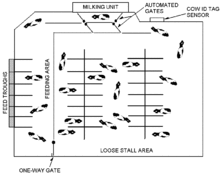 The barn may be arranged such that access to the main feeding area can only be obtained by passing the milking unit. This layout is referred to as forced cow traffic. Alternatively, the barn may be set up such that the cow always has access to feed, water, and a comfortable place to lie down, and is only motivated to visit the milking system by the palatable feed available there. This is referred to as free cow traffic.