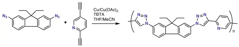 The utility of the Cu(I)-catalyzed click reaction has also been demonstrated in the polymerization reaction of a bis-azide and a bis-alkyne with copper(I) and TBTA to a conjugated fluorene based polymer.[8] The degree of polymerization easily exceeds 50. With a stopper molecule such as phenyl azide, well-defined phenyl end-groups are obtained.