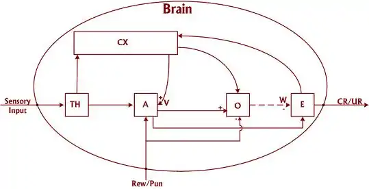 O, the orbitofrontal cortex, operates based on the difference between the perceived (i.e. expected) reward/punishment and the actual received reward/punishment. This perceived reward/punishment is the one that has been developed in the brain over time using learning mechanisms and it reaches the orbitofrontal cortex via the sensory cortex and the amygdala. The received reward/punishment on the other hand, comes courtesy of the outside world and is the actual reward/punishment that the specie has just obtained. If these two are identical, the output is the same as always through E. If not, the orbitofronal cortex inhibits and restrains emotional response to make way for further learning. So the path W is only activated in such conditions.