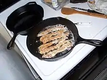 Bacon is cured through either a process of injecting it with or soaking it in brine, known as wet curing, or using plain crystal salt, known as dry curing.[1][7] Bacon brine has added curing ingredients, most notably nitrites or nitrates, which speed the curing and stabilize colour. Fresh bacon may then be dried for weeks or months in cold air, or it may be smoked or boiled.[1] Fresh and dried bacon are typically cooked before eating, often by pan frying. Boiled bacon is ready to eat, as is some smoked bacon, but they may be cooked further before eating. Differing flavours can be achieved by using various types of wood, or less common fuels such as corn cobs or peat. This process can take up to eighteen hours, depending on the intensity of the flavour desired. The Virginia Housewife (1824), thought to be one of the earliest American cookbooks, gives no indication that bacon is ever not smoked, though it gives no advice on flavouring, noting only that care should be taken lest the fire get too hot.[8] In early American history, the curing and smoking of bacon (like the making of sausage) seems to have been one of the few food-preparation processes not divided by gender.[9]