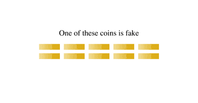 A well-known example has up to nine items, say coins (or balls), that are identical in weight except one, which is lighter than the others—a counterfeit (an oddball). The difference is perceptible only by weighing them on scale—but only the coins themselves can be weighed. How can one isolate the counterfeit coin with only two weighings?
