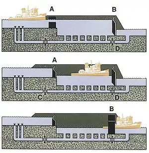 When the water pressure is equal on both sides of the gate, the lower gates (B) are opened, allowing the vessels to leave the lock chamber.[2]:2