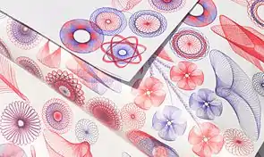 The popular Spirograph, mass-marketed in America during the advent of 1960s psychedelic culture,[9] included colored ballpoints (black, blue, red, green) as part of its boxed set.[10] The holes positioned on a Spirograph's "gears" were reportedly sized to accommodate tips of the fine-point pens provided.[10]
