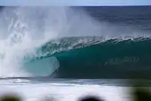 There are four waves associated with Pipeline. The left (which means the wave breaks from left to right from the perspective of a watcher on shore) known as Pipeline (a.k.a. First Reef) is the most commonly surfed and photographed. When the reef is hit by a north swell, the peak (the highest tipping-point of the wave where it begins to curl) becomes an A-frame shaped wave, with Pipe closing out a bit and peeling off left, and the equally famous Backdoor Pipeline peeling away to the right at the same time. As the size at Pipe increases, over 12 feet usually, Second Reef on the outside (further out into the deeper ocean waters) starts breaking, with longer walls (the unbroken face of the wave that the surfer slides across), and more size. At an extreme size, an area called Third Reef even further outside starts to break with giant waves.[1]