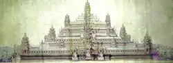 The Baphuon (Khmer: ប្រាសាទបាពួន) is a temple at Angkor, Cambodia. It is located in Angkor Thom, northwest of the Bayon. Built in the mid-11th century, it is a three-tiered temple mountain[1]:103 built as the state temple of Udayadityavarman II[2]:103 dedicated to the Hindu God Shiva. It is the archetype of the Baphuon style with intricate carvings covering every available surface.[3] The temple adjoins the southern enclosure of the royal palace and measures 120 metres east-west by 100 metres north-south at its base and stands 34 meters tall without its tower, which would have made it roughly 50 meters tall. Its appearance apparently impressed Temür Khan's late 13th century envoy Chou Ta-kuan during his visit from 1296 to 1297, who said it was 'the Tower of Bronze...a truly astonishing spectacle, with more than ten chambers at its base.'