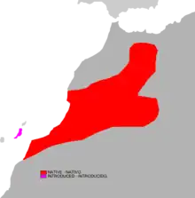 The Barbary ground squirrel is found on the Barbary Coast of Western Sahara, Morocco and Algeria on the seaward side of the Atlas Mountains and was introduced into the island of Fuerteventura in the Canary Islands in 1965.[1] It is the only species of squirrel to inhabit Africa north of the Sahara barring a small population of striped ground squirrel in southern Morocco.[3] Its habitat is arid rocky ground and it is found in mountainous regions up to an altitude of about 4,000 metres (13,000 ft).[3]