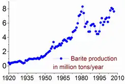 The baryte reserves are estimated between 0.7 and 2 billion tonnes. The maximum production, 8.3 million tonnes, was produced in 1981, but only 7–8% was used for barium metal or compounds.[5]:5 Baryte production has risen since the second half of the 1990s from 5.6 million tonnes in 1996 to 7.6 in 2005 and 7.8 in 2011. China accounts for more than 50% of this output, followed by India (14% in 2011), Morocco (8.3%), US (8.2%), Turkey (2.5%), Iran and Kazakhstan (2.6% each).[20]