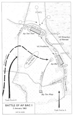 In November 1962, the VC's Military Region 2 ordered the VC 261st Battalion and the 514th Battalion, the home battalion of Dinh Tuong Province, to destroy the strategic hamlets in their region and at the same time to attack South Vietnamese sweeping operations.[18] Between 28–30 December 1962, an American aircraft equipped with eavesdropping equipment located a VC radio transmitter.[19] It intercepted radio signals in the hamlet of Ap Tan Thoi in Dinh Tuong Province where the ARVN 7th Infantry Division was headquartered. The radio intercept and other information obtained by Jim Drummond, Vann's intelligence officer, indicated that the VC were using Ap Tan Thoi as a headquarters location.[19] Furthermore, South Vietnamese and American intelligence personnel believed the VC had deployed a reinforced company of about 120 men to protect the transmitter. Certain that the VC unit was no larger than the reported number, the ARVN 7th Infantry Division was instructed to attack Ap Tan Thoi.[20]