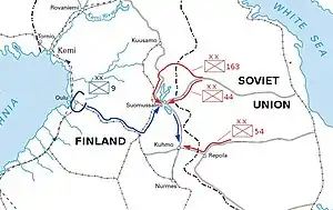 By conquering Northern Finland, the Soviet leadership wanted to occupy the entire Finnish state and cut off the traffic routes to its neighbors during the war.[1] In order to support the advance of the 163rd Rifle Division and 44th Motorized Rifle Division on Oulu, the 54th Rifle Division was to advance south to cut off any routes for reinforcements from the Finnish heartland.[2]