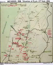 During the unsuccessful attack of the 5th Cavalry Division on Nazareth in the early morning of 20 September, Liman von Sanders accompanied by General Kiazim, Major Prigge and Rittmeister Hecker, had escaped on their way to Damascus. They arrived at Tiberias during the afternoon of 20 September, before continuing on to Samakh and Deraa.[6][7][8] He alerted the garrisons he passed to the advance of the EEF and ordered the establishment of a rearguard line. The line was to run from Deraa down the Yarmuk River Valley, across the Jordan River and west to Samakh, around the shore of the Sea of Galilee to Tiberias and northwards to Lake Huleh. Two main roads and the railway lines to Damascus, would be protected and time gained for the development of the defence of Damascus, if the garrisons were not defeated.[4][9][10] Liman von Sanders described Samakh "as the essential link between the two main sectors of the line" but also "the weak link between the two-halves."[11][12] He reinforced the garrison at Samakh with German machine gunners and ordered the commander, a German officer to hold the town to the last man.[9]