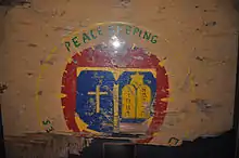 There is a Beirut Memorial Room in the USO in Jacksonville, North Carolina, that includes a wall with the names of all those who died in the attack, along with the words "They Came in Peace."[9] The Armed Forces Chaplaincy Center, the site of Chaplain Corps training for the U.S. Army, Navy, and Air Force at Fort Jackson, in Columbia, South Carolina, includes the partially destroyed sign from the Beirut barracks chapel as a memorial to those who died in the attack.[10] According to Rabbi Arnold Resnicoff, one of the Navy chaplains present during the attack, "Amidst the rubble, we found the plywood board which we had made for our "Peace-keeping Chapel." The Chaplain Corps Seal had been hand-painted, with the words "Peace-keeping" above it, and "Chapel" beneath. Now "Peace-keeping" was legible, but the bottom of the plaque was destroyed, with only a few burned and splintered pieces of wood remaining. The idea of peace—above; the reality of war—below."[10]