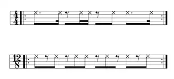 The following 24-pulse bell pattern is used in the Ewe rhythm kadodo.[30] The three single strokes are muted. The kadodo bell pattern is an embellishment of three "slow" cross-beats spanning two measures, or three-over-eight (3:8).