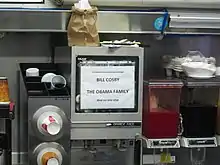 The most famous regular customer is comedian Bill Cosby, who took his future wife to Ben's when they were dating.[9] He recalls that he first became a frequent visitor while serving in the Navy and stationed in Bethesda, Maryland in 1958, and frequently visited the U Street jazz clubs.[22] Cosby recalls that during some of his visits with Camille, who was then a student at the University of Maryland, he would "eat as many as six half-smokes at a time."[22] Cosby returned to Ben's in 1985 to hold a press conference in the restaurant to celebrate the success of his television series, The Cosby Show.[11] He continues to stop by Ben's while in town for servings of half-smokes. A sign posted in the restaurant proclaimed that Bill Cosby is the only person who eats for free at Ben's Chili Bowl.[23] On November 3, 2008, a new sign was posted to add "the Obama family".[24] Starting in 2012 a large mural featuring Cosby adorned the building, but was removed in January 2017 amid sexual assault allegations against the comedian.[25]