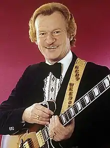 He joined the BBC Show Band directed by Cyril Stapleton in the 1950s, when he began to be featured as a soloist.[5] He also worked as a session musician on many early British rock and roll and other records for artists such as Adam Faith, Billy Fury and Tommy Steele and worked as an accompanist to visiting American singers such as Frank Sinatra, Judy Garland and Nat King Cole. It is estimated that he performed on over 5,000 BBC radio broadcasts.[3] He was also seen regularly on British television in the 1950s, including some of the most popular children's television programmes.[3] In 1959 he was asked by Top Rank Records to make a record as a solo guitarist.[5] He became the first British guitarist in the UK Singles Chart, with "Guitar Boogie Shuffle" in 1959,[6] and was cited as an influence by many stars, including Eric Clapton, Brian May, Paul McCartney, George Harrison, John Lennon, Pete Townshend, Keith Richards, Sting, Hank Marvin, Robert Smith, Mike Oldfield, Mark Knopfler and Jimmy Page.[1][2][3]