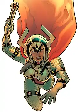 Big Barda is a fictional superheroine (although sometimes portrayed as a villain) appearing in American comic books published by DC Comics. She first appeared in Mister Miracle #4 (October 1971), and was created by Jack Kirby.[1] Jack Kirby based Barda's physical appearance on Lainie Kazan, who had recently appeared topless in Playboy.[2] Mark Evanier, Kirby's assistant on the Fourth World comics, has explained the genesis of the character: "Jack based some of his characters (not all) on people in his life or in the news... the characterization between Scott 'Mister Miracle' Free and Barda was based largely—though with tongue in cheek—on the interplay between Kirby and his wife Roz".[3] In 2011, Big Barda was ranked 75th in Comics Buyer's Guide's "100 Sexiest Women in Comics" list.[4]