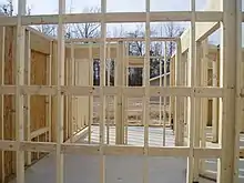 Blocking (in American English) is the use of short pieces (blocks) of dimensional lumber in wood framed construction. Uses include filling, spacing, joining, or reinforcing members.[1] Blocking is typically made from short off-cuts or defective, warped pieces of lumber. Names for similar materials in other forms of English include dwang, nog, noggin, and nogging.