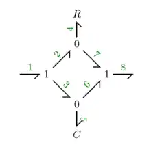 However, there is an issue with 0-junction on the left. The 0-junction has two causal bars at the junction, but the 0-junction wants one and only one at the junction. This was caused by having be in the preferred causality. The only way to fix this is to flip that causal bar. This results in a causal conflict, the corrected version of the graph is below, with the representing the causal conflict.