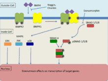 BMP4, as a member of the transforming growth factor-β (TGF-β) family binds to 2 different types of serine-threonine kinase receptors known as BMPR1 and BMPR2.[25] Signal transduction via these receptors occurs via Smad and map kinase pathways to effect transcription of its target genes. In order for signal transduction to occur, both receptors must be functional. BMP is able to bind to BMPR2 without BMPR1 however, the affinity significantly increases in the presence of both receptors. BMPR1 is transphosphorylated via BMPR2 which induces downstream signalling within the cell, affecting transcription.[25]