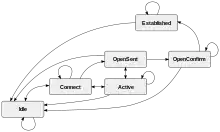 In order to make decisions in its operations with peers, a BGP peer uses a simple finite state machine (FSM) that consists of six states: Idle; Connect; Active; OpenSent; OpenConfirm; and Established. For each peer-to-peer session, a BGP implementation maintains a state variable that tracks which of these six states the session is in. The BGP defines the messages that each peer should exchange in order to change the session from one state to another.