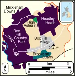 ![]() Map of Box Hill, showing the areas managed by the National Trust (purple), Surrey Wildlife Trust (turquoise) and Surrey County Council (green). The urban area of Box Hill village is shown in grey.