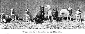 The white female dog Ch. Blanka von Angertor, Flocki's sister, was even more influential when mated with Piccolo von Angertor (Lechner's Box grandson) to produce the predominantly white (parti-colored) female dog Meta von der Passage, which, even bearing little resemblance with the modern Boxer standard (early photographs depict her as too long, weak-backed and down-faced), is considered the mother of the breed.[30][31] John Wagner, in The Boxer (first published in 1939) said the following regarding this female dog:[32]
